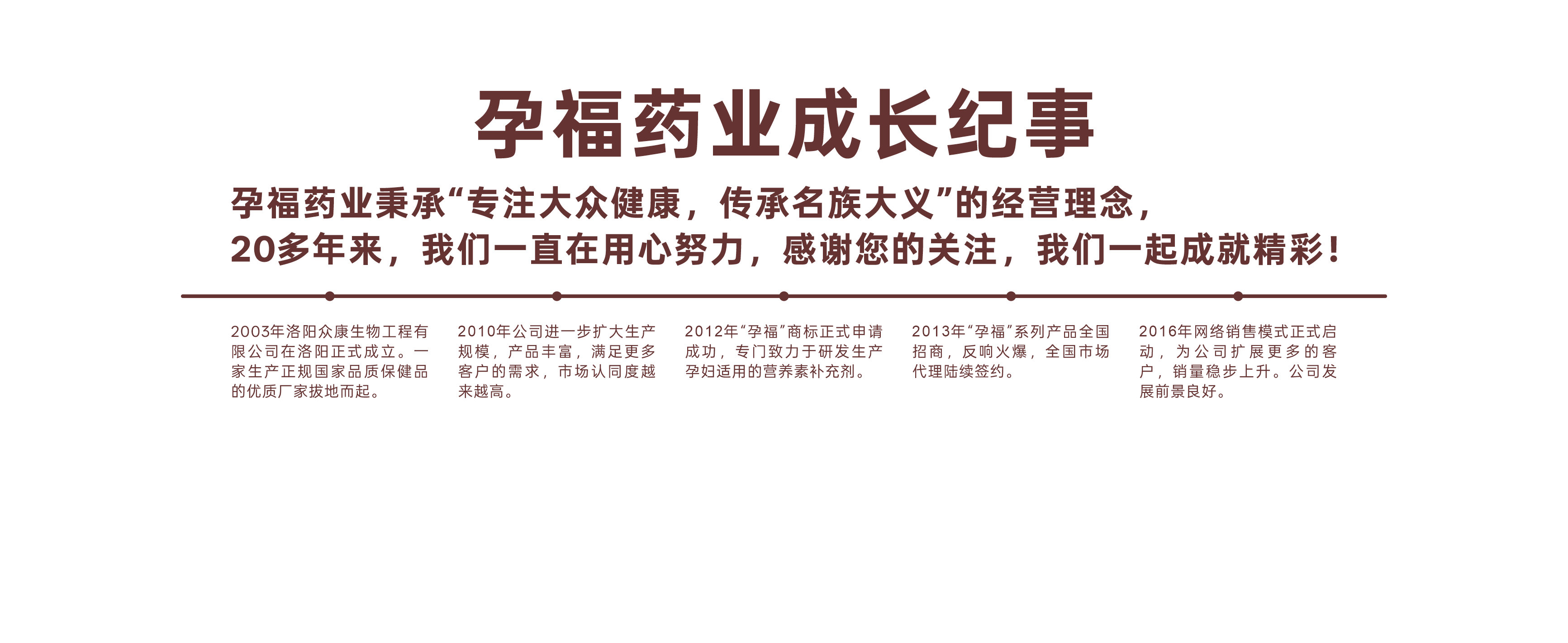 众康生物成立于2003年,坐落在世界文化遗产龙门石窟南200米,是集科研、生产、销售于一体的保健食品、普通食品及孕妇乳母营养补充食品的生产企业。公司占地总面积28000平方米。员工100余人,其中,科研、技术、营销人员60余人;2003年成为保健食品生产GMP达标企业。历时22年的发展历程众康生物取得了长足发展,公司已形成了10万级无尘无菌GMP认证生产基地,涵盖软胶囊、片剂、硬胶囊、口服液、颗粒剂、粉剂、固体饮料、压片糖果等多剂型的专业生产线,日产各种保健品400万粒(片/支)。